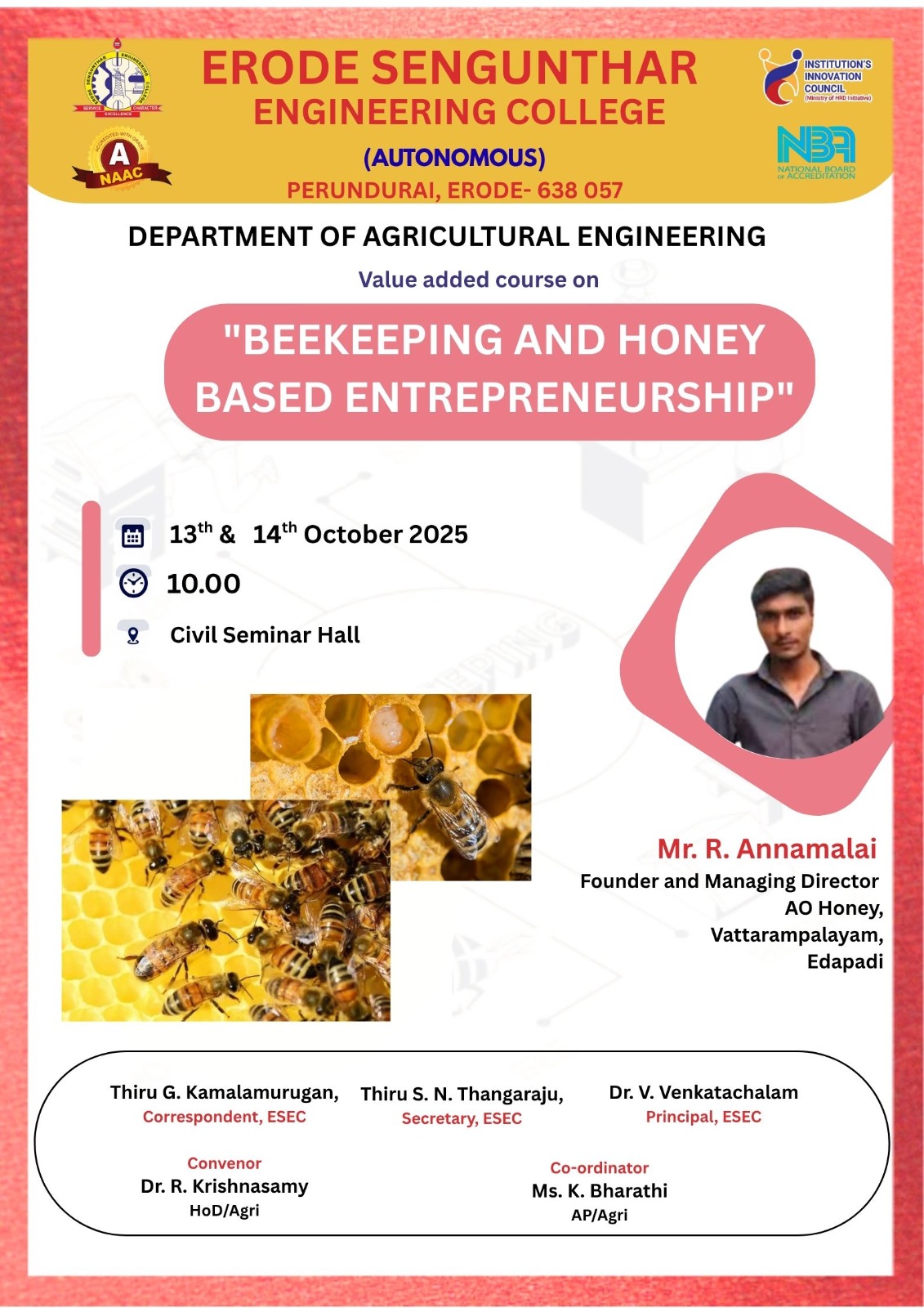 - “A Value Added Course on Beekeeping and Honey-Based Entrepreneurship is scheduled on 13th & 14th October 2025 for II Year Agricultural Engineering students to enhance their skills in scientific beekeeping and honey-based enterprise development.”