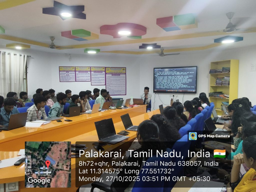 The Hands-on Workshop on AI-Powered Cyber Forensics: Driving Start-up Innovation in Digital Security was successfully conducted on 27.10.2025, as a self-driven initiative under the start-up theme. The session was handled by Mr. S. Sunil Kumar, Assistant Professor in Cyber Forensics from the University of Madras, Chennai, who shared valuable insights on integrating artificial intelligence with cyber forensics to build innovative digital security solutions.