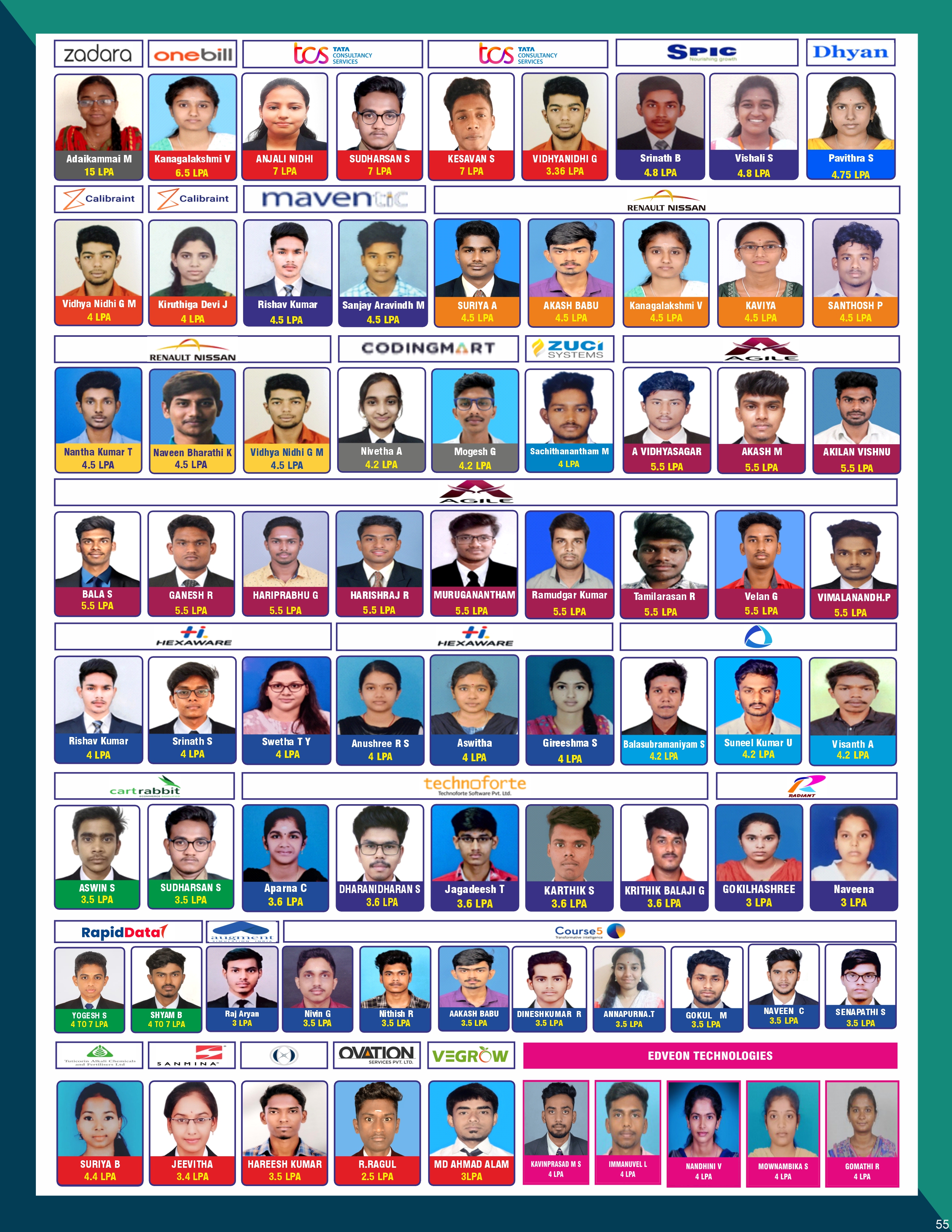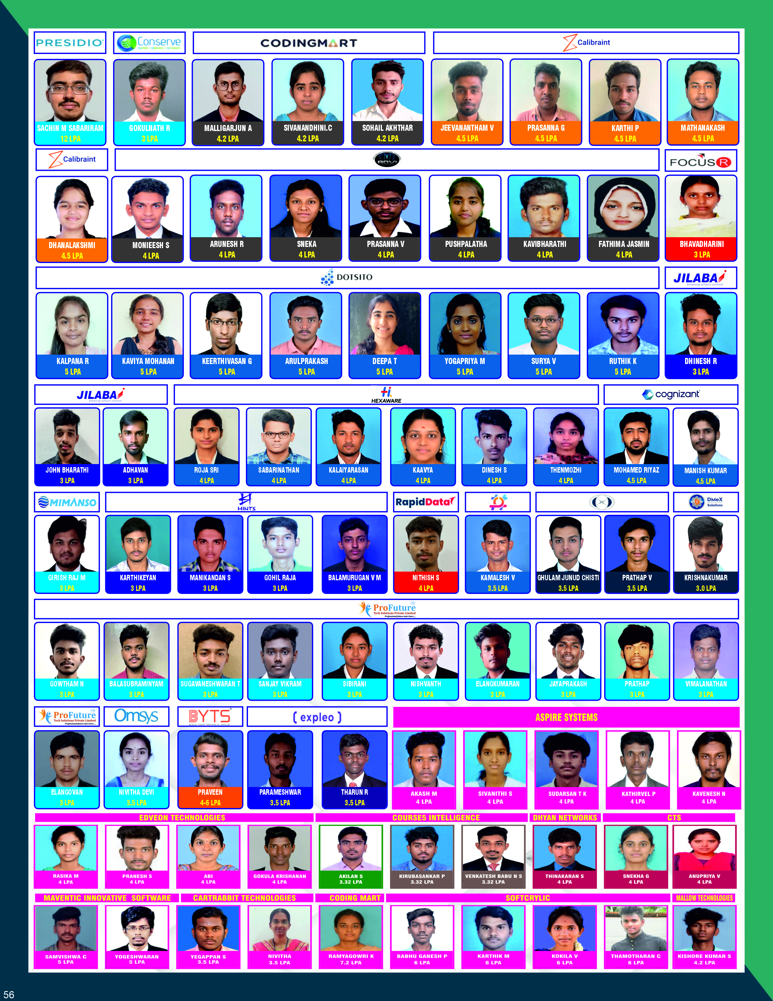 | 57 | OVIYA A | 730422104081 | BE-CSE | ON CAMPUS | NEW JAISA,BANGALORE | 2.5 LPA |