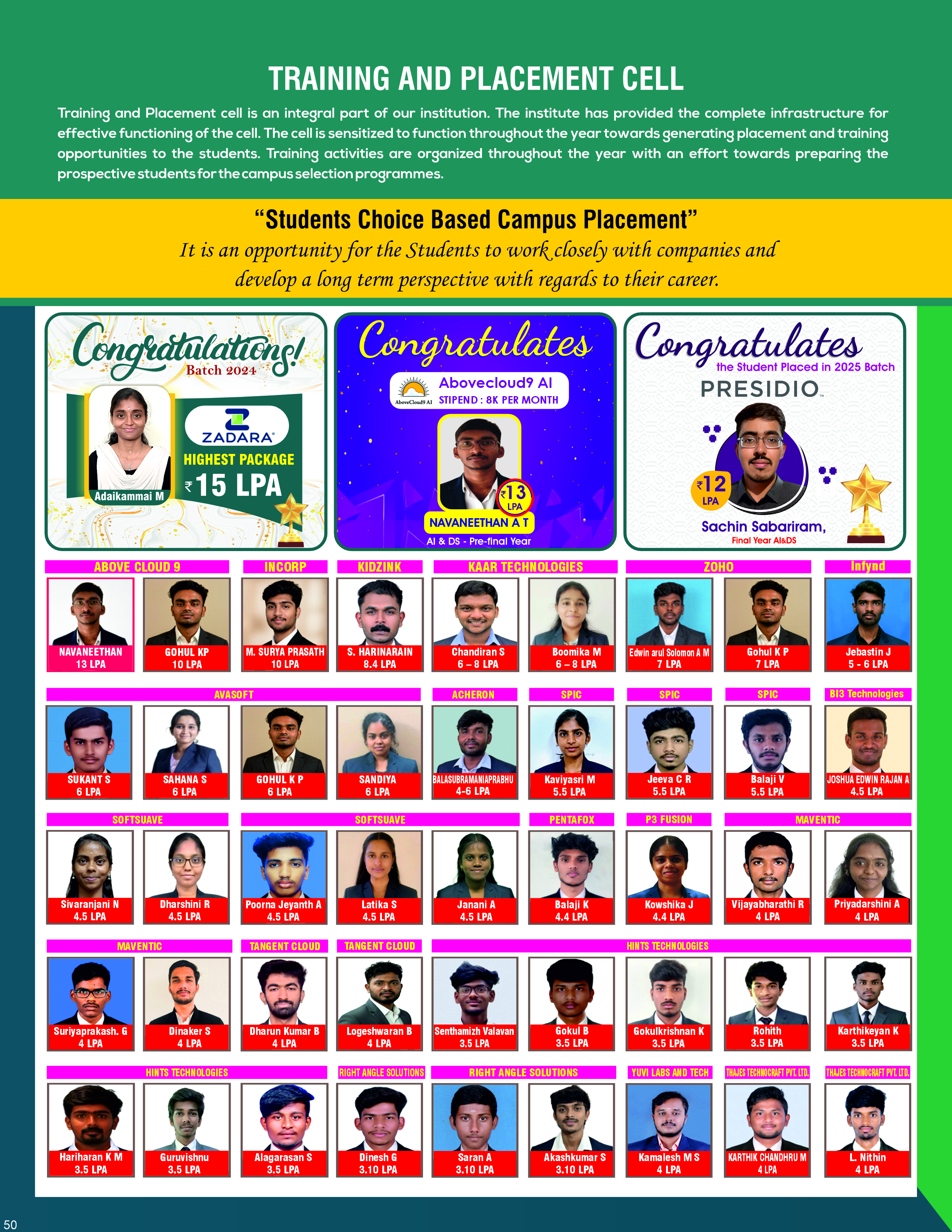 | 12 | CHANDIRAN S | 730422104018 | BE-CSE | ON CAMPUS ON CAMPUS | 1.CUBE AI ,TIRUCHENGODE 2.KAAR TECHNOLOGIES,CHENNAI | 3 LPA 6.5 LPA |