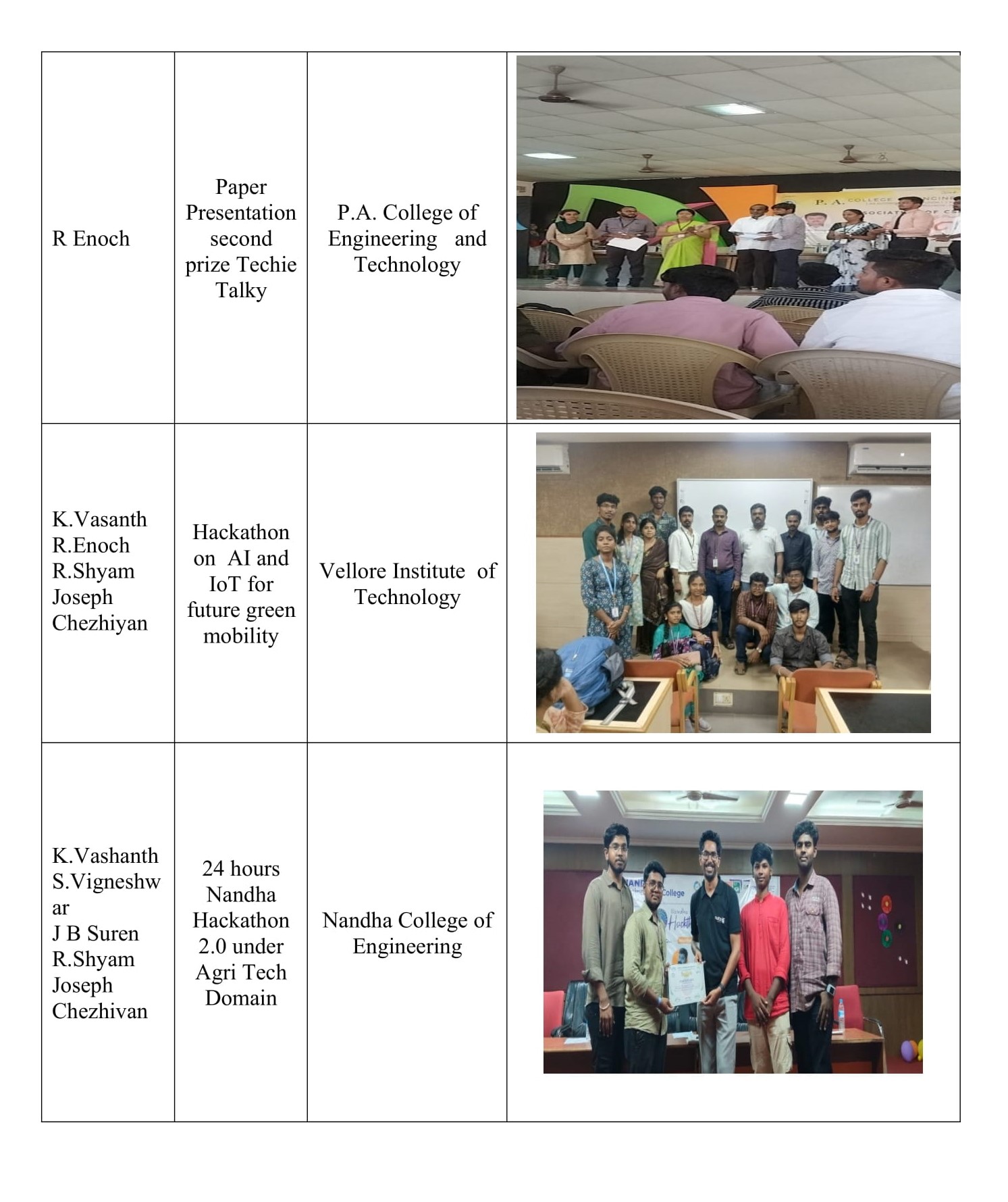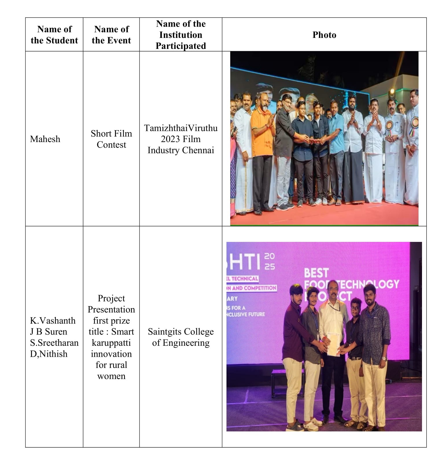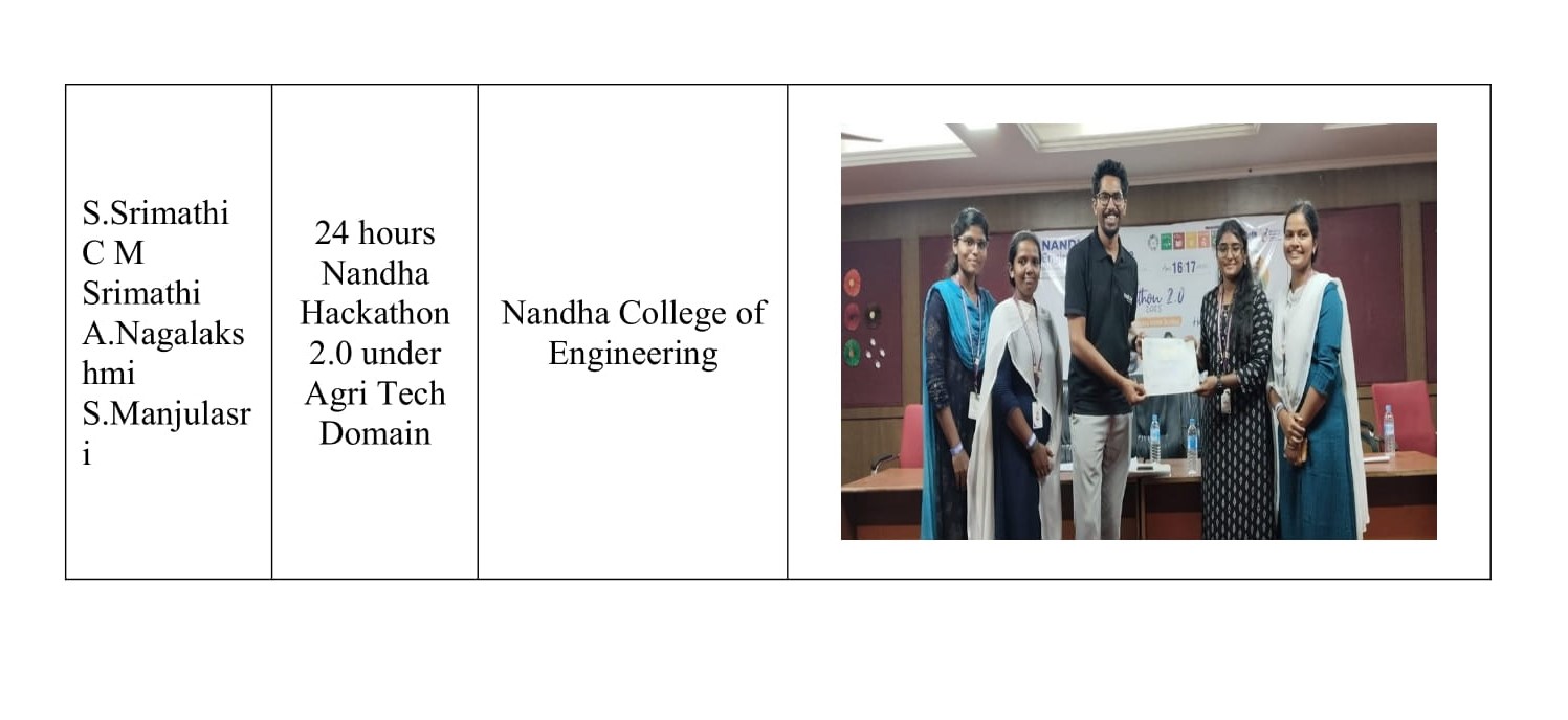 B.E. CSD MenuVision Mission Message from the Head of Department Core Values PEO PO PSO Faculty Details Research & Fundings Faculty Development Students Participants Students Project & Product Industry – Institute Interaction Laboratory Faculty & Students Achievements Placement BoS COMPUTER SCIENCE AND DESIGN Achievements of Faculty and Students FacultyStudents 2024-2025 Best Faculty Award – Ms.S.Sivaselvi , Assistant Professor 2024-2025